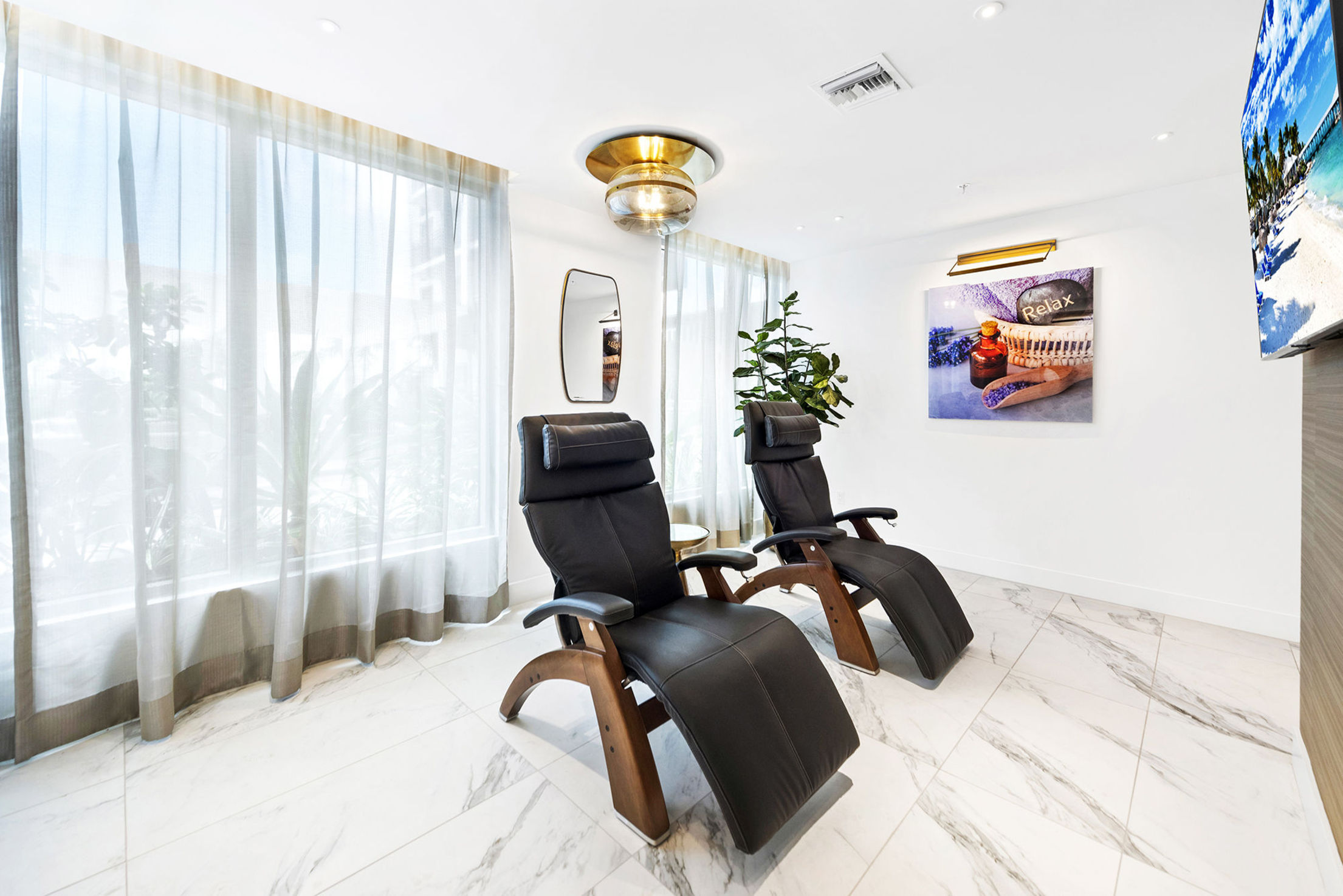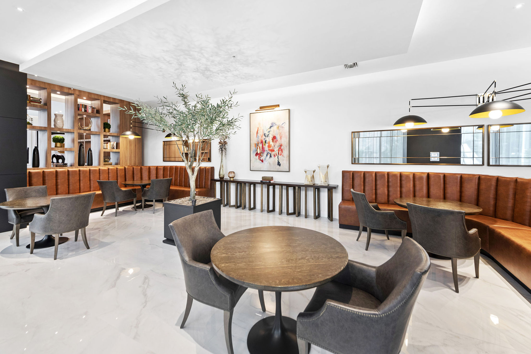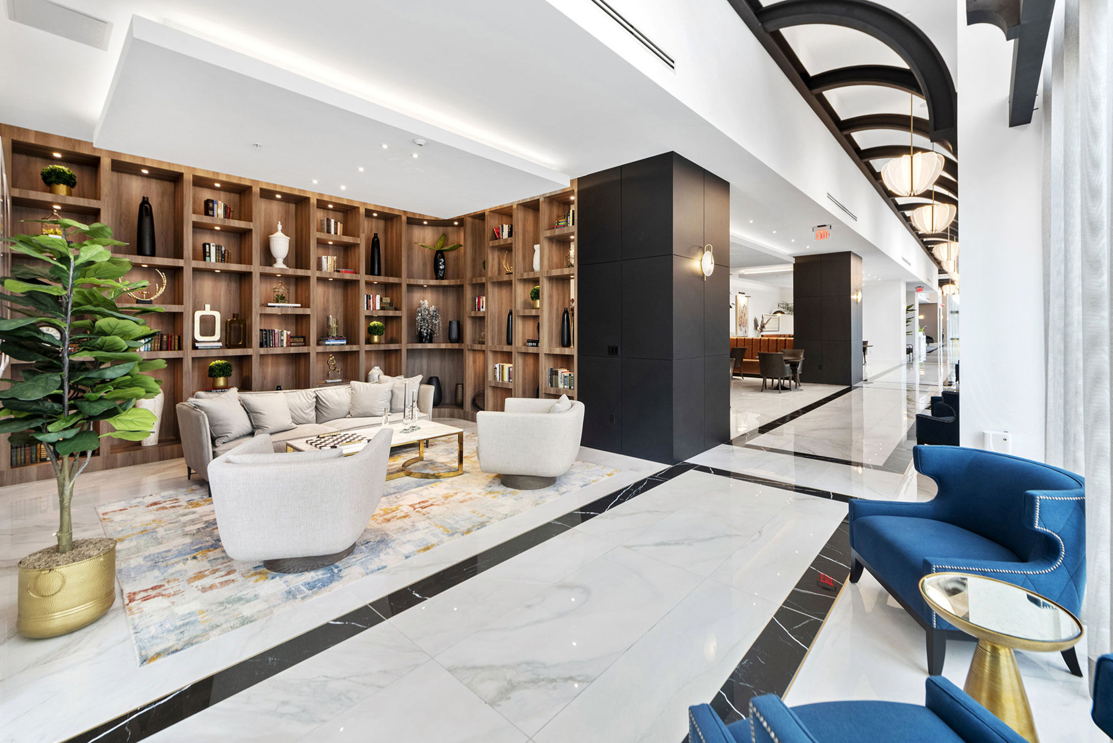 The double-height marble lobby offers private space for sitting and working before heading up to the pool deck within Downtown Miami’s skyline.  Throughout the day, residents enjoy a well-equipped gym, spa, sauna, hair salon, pet care facility, and an outdoor kitchen and lounge.